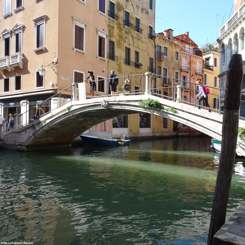 A Venise une rue porte aussi le nom de Goldoni, la calle Goldoni mais aussi un pont et une fondamenta. Premièrement de la fondamenta Carlo Goldoni vous gravissez le pont qui vous emmène vers le campo San Luca. Et deuxièment le ponte Carlo Goldoni enjambe le rio dei Fuseri pour rejoindre le rio Scoacamini. En outre, c’est un pont en pierre d’Istrie construit en 1909, il mesure 12m28 en longueur, 3,75 en largeur et il est haut de 2m79.